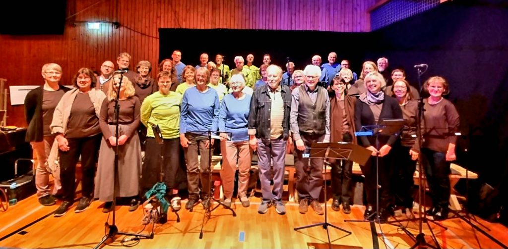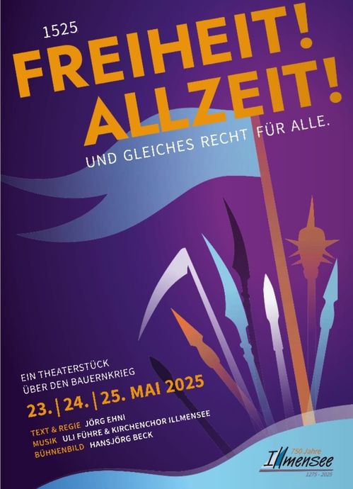 Zeit- und gesangsintensive Monate liegen hinter uns für das Bauernkriegstheater „Freiheit! Allzeit!“. Es galt 11 Stücke zu lernen, die Uli Führe aus Freiburg mit Texten von Jörg Ehni in einer Hauruck-Aktion eigens für unseren Chor bzw. für Illmensee komponiert hat. Sofort haben uns die Stücke in den Bann gezogen und wir tauchten in mannigfaltige Gefühlswelten ein: Hierarchie und Unterdrückung, Wut und Kampf, Blut und Tod, Hoffnung und Frieden, das alles konnte Uli Führe in einer gewaltigen Vertonung widerspiegeln. Für uns als Kirchenchor eine ganz neue Erfahrung: viele Takt- und Tonartwechsel, Umswitchen von Unisono und Mehrstimmigkeit, Ausdrucksstärke passend zu jeder neuen Szene – eine enorme Herausforderung für Dirigent und Chor. Dann war er da, der große Auftritt in der Drei-Seen-Halle: Zu den fesselnden Szenen auf der Bühne setzten wir die musikalischen Akzente. Volker Bals begleitete uns bravourös am Klavier und Matthias Reichle verschärfte mit der Trommel besonders düstere Szenen.
