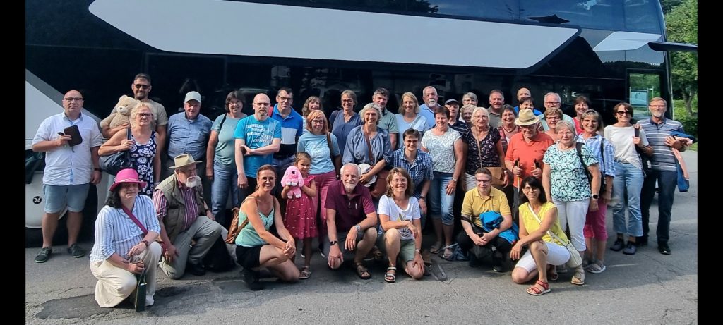 Anfang Juli starteten wir bei sonnigem Wetter unseren Ausflug mit einem Doppeldecker-Bus in Richtung Waldburg zur „vom Fass“ Manufaktur. Bei der Führung lernten wir alles über die Verarbeitung und Erzeugnisse von heimischem Streuobst. Nach verschiedenen „Probiererle“ fiel uns beim Einkaufen direkt im Laden nebenan mit den feinsten Produkten die Auswahl schwer: Saft, Essig, Öl, Marmelade, Gewürze, Spirituosen und vieles mehr. Unser reichhaltiges 2. Frühstück mit unzähligen Leckereien und „Gmischte“ (Leberkäs und Fleischsalat im Wecken) ist schon Tradition und fester Bestandteil unserer Ausflüge. Die Fahrt ging weiter nach Isny, hier lud uns der schöne Markplatz mit den Wasserfontänen und Sitzgelegenheiten zum Verweilen ein. Bei der Stadtführung tauchten wir in die Geschichte der historischen Altstadt ein: Rathaus, Wehrgang der Stadtmauer, Kirchen und eine Kunstausstellung im Schloss, das einst ein Benediktinerkloster war; ein Streifzug durch eine jahrhundertealte Zeit. Nach Kaffee, Kuchen und/oder Eisbecher ging es wieder zurück in die Heimat. Rainer und sein Team verwöhnten uns beim Abendessen mit feinen Speisen aus der Restaurant-Karpfen-Küche und so ließen wir einen tollen Ausflugstag vollgepackt mit Erlebnissen und Eindrücken ausklingen, um wieder einmal zu sagen: „Scheee war’s!“
